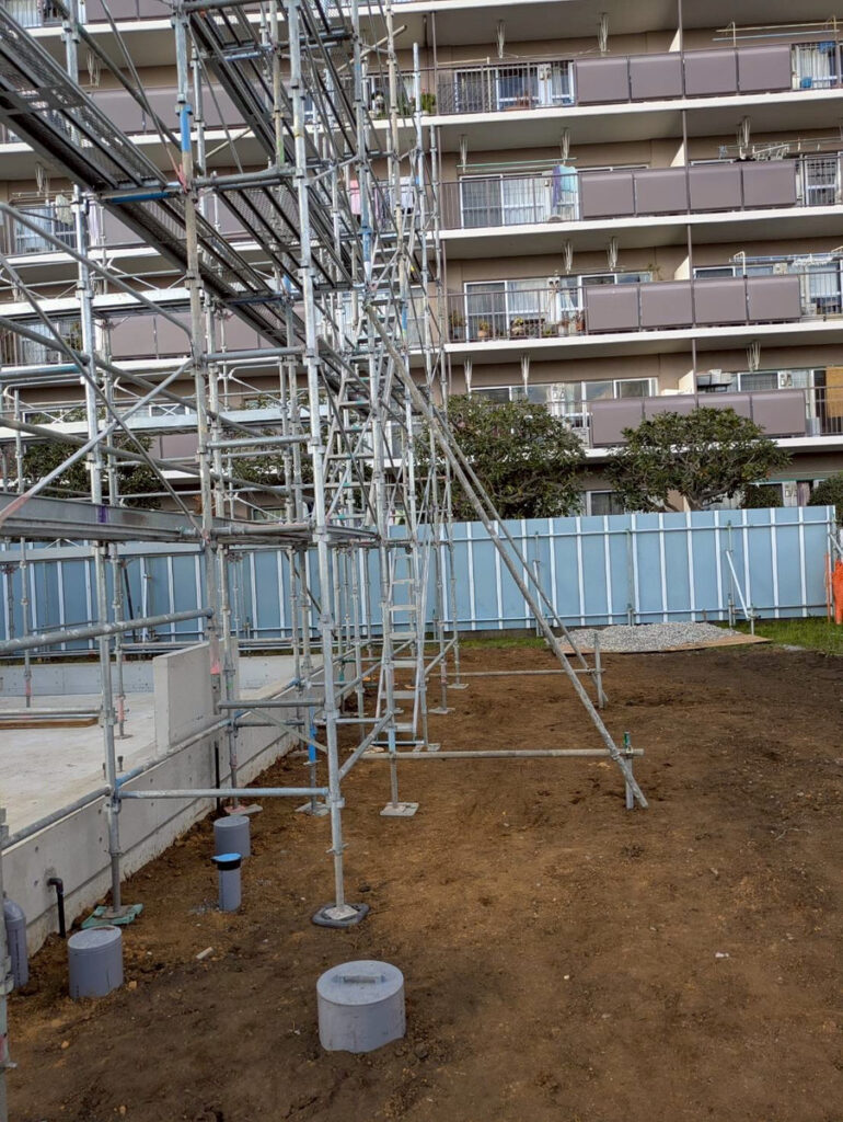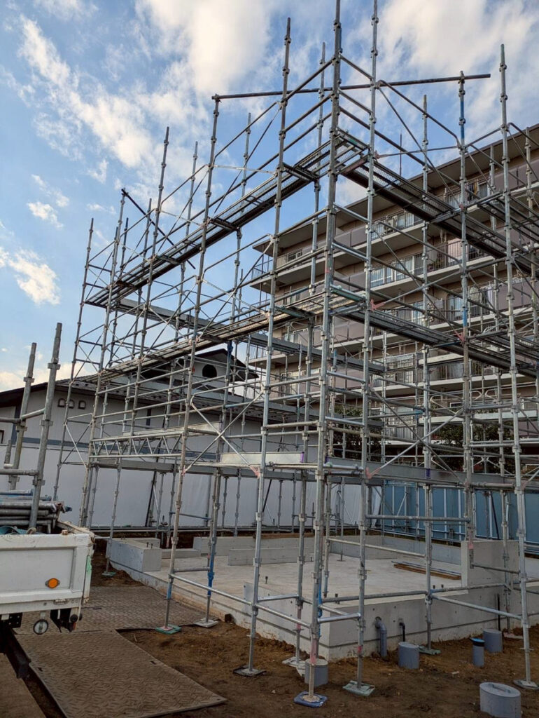 本日は、某消防施設の新築工事、先行足場設置に着手しました。